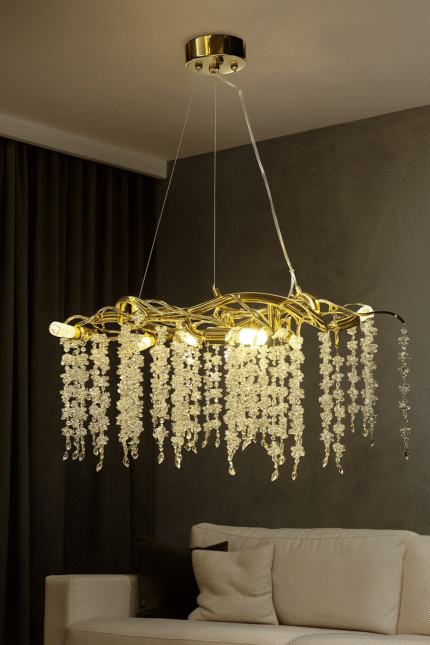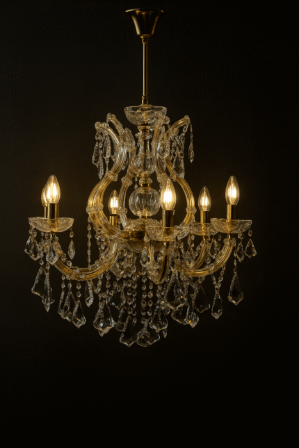 نجفة فاخرة تجمع بين فريم مستورد مطلي باللون الذهبي الفاخر وقطع كريستال أصلية من إنتاج كريستال عصفور عالية النقاء، تعكس الضوء ببريق أخّاذ يملأ المكان بالفخامة والرقي.