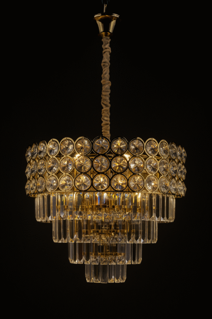 تجمع هذه النجفة الفاخرة بين هيكل من الستانلس المطلي باللون الذهبي اللامع وقطع كريستال K9 عالية الجودة المستوردة، لتقدم توازناً مذهلاً بين الفخامة العصرية والتفاصيل الكلاسيكية الدقيقة.